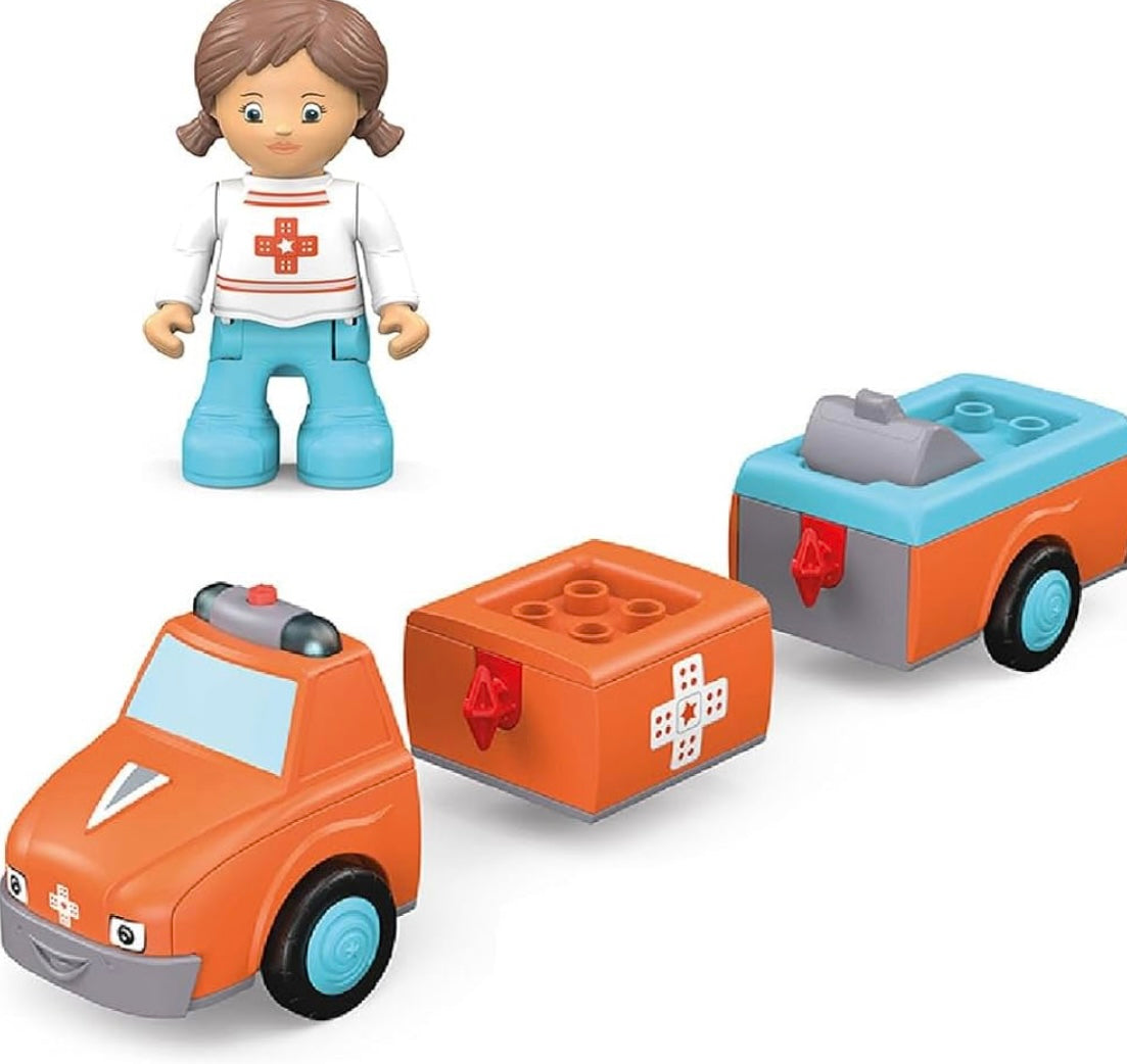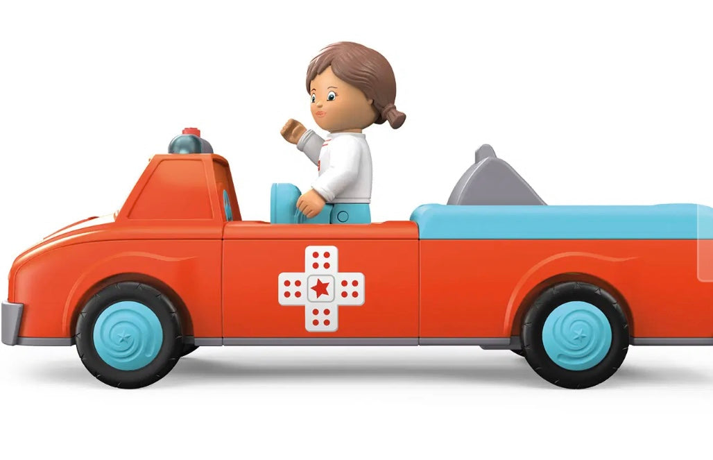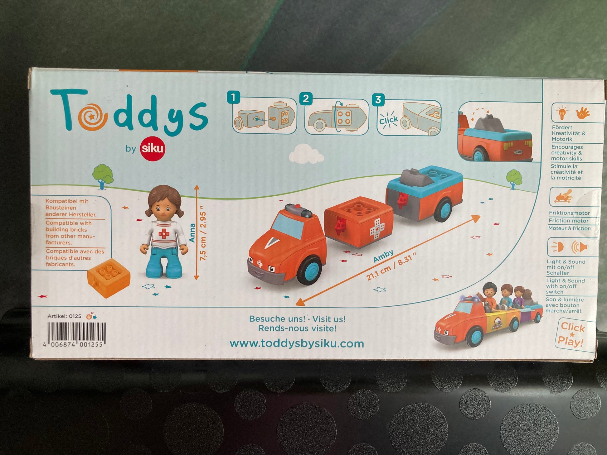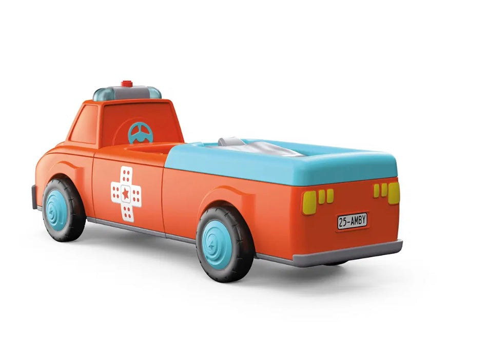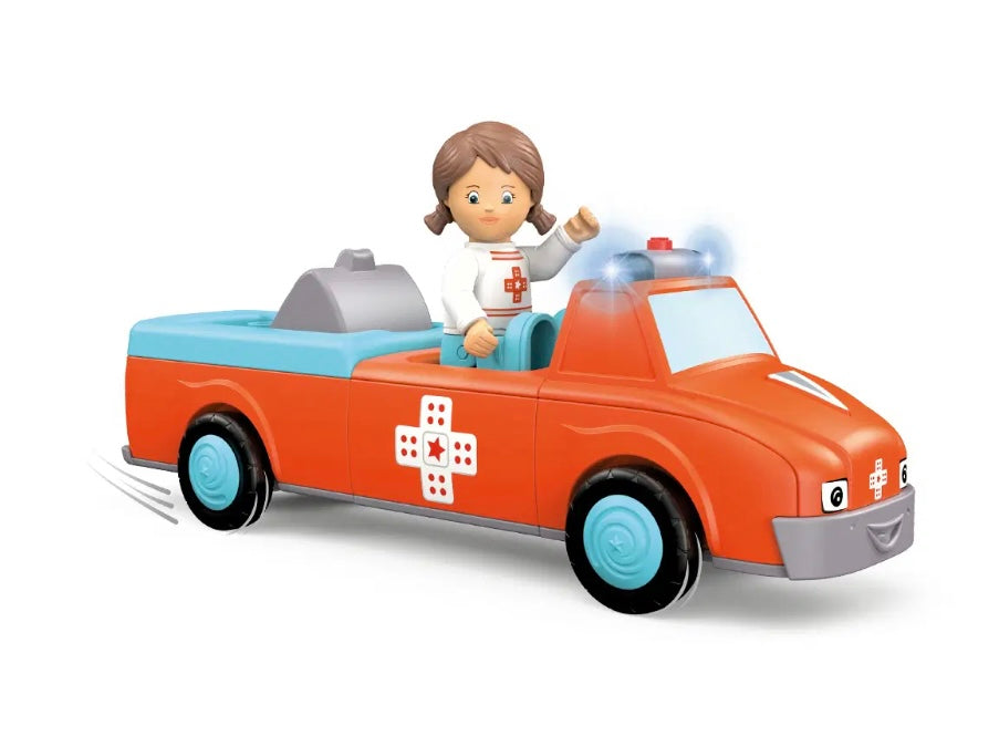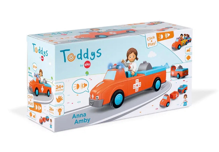 Wanneer bij Anna en Amby de telefoon voor noodgevallen overgaat, heeft er iemand dringend hulp nodig! Anna schakelt de sirene in en de felrode Amby haast zich met blauw zwaailicht naar het ongeval. Op locatie onderzoekt Anna het slachtoffer en begint meteen met de eerste hulp. Anna kan hierbij vaak al goed helpen en de pijn doen vergeten. Vervolgens legt ze de patiënt op Amby's superzachte brancard. Dankzij de verstelbare rugsteun kan de patiënt zittend of liggend worden vervoerd. Nu zit Anna weer op de chauffeursstoel en vertrekken de drie naar het dichtstbijzijnde ziekenhuis. Wanneer ze de patiënt hebben afgeleverd, bereiden Anna en Amby zich meteen weer voor op de volgende inzet. Spannend, hoogwaardig speelgoed met frictiemotor (vliegwielmotor) voor kinderen vanaf 24 maanden voor het verbeteren van de fijne motoriek, uithoudingsvermogen, geduld en plezier. Speelfiguur Anna is beweeglijk: het hoofd kan worden gedraaid, de armen kunnen omhoog en de benen kunnen worden geknikt. Het voertuig Amby kan in drie delen uit elkaar worden genomen en kan met andere Toddy's voertuigen worden gecombineerd. Licht- en geluidseffecten ondersteunen het karakter van het voertuig. Het kussen van de brancard kan omhoog en omlaag worden geklapt zodat de figuur zittend of liggend kan worden vervoerd.