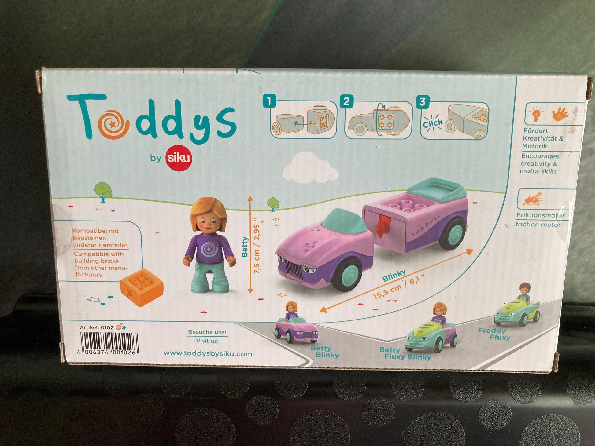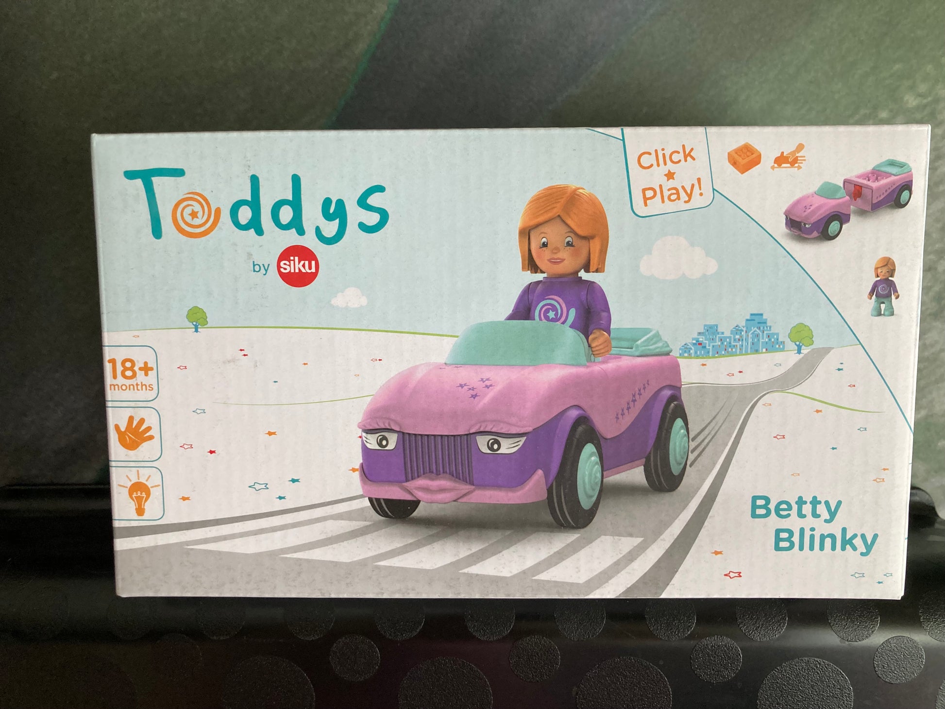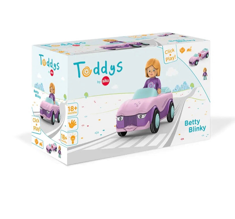 Speelfiguur Betty is zeer beweeglijk: het hoofd kan worden gedraaid, de armen kunnen omhoog en de benen kunnen worden geknikt. De auto Blinky kan in twee delen uit elkaar worden genomen en kan met andere Toddy's voertuigen worden gecombineerd. Charmante ogen, een glanzende mond en de fonkelende sterren zijn Blinky's kenmerken.