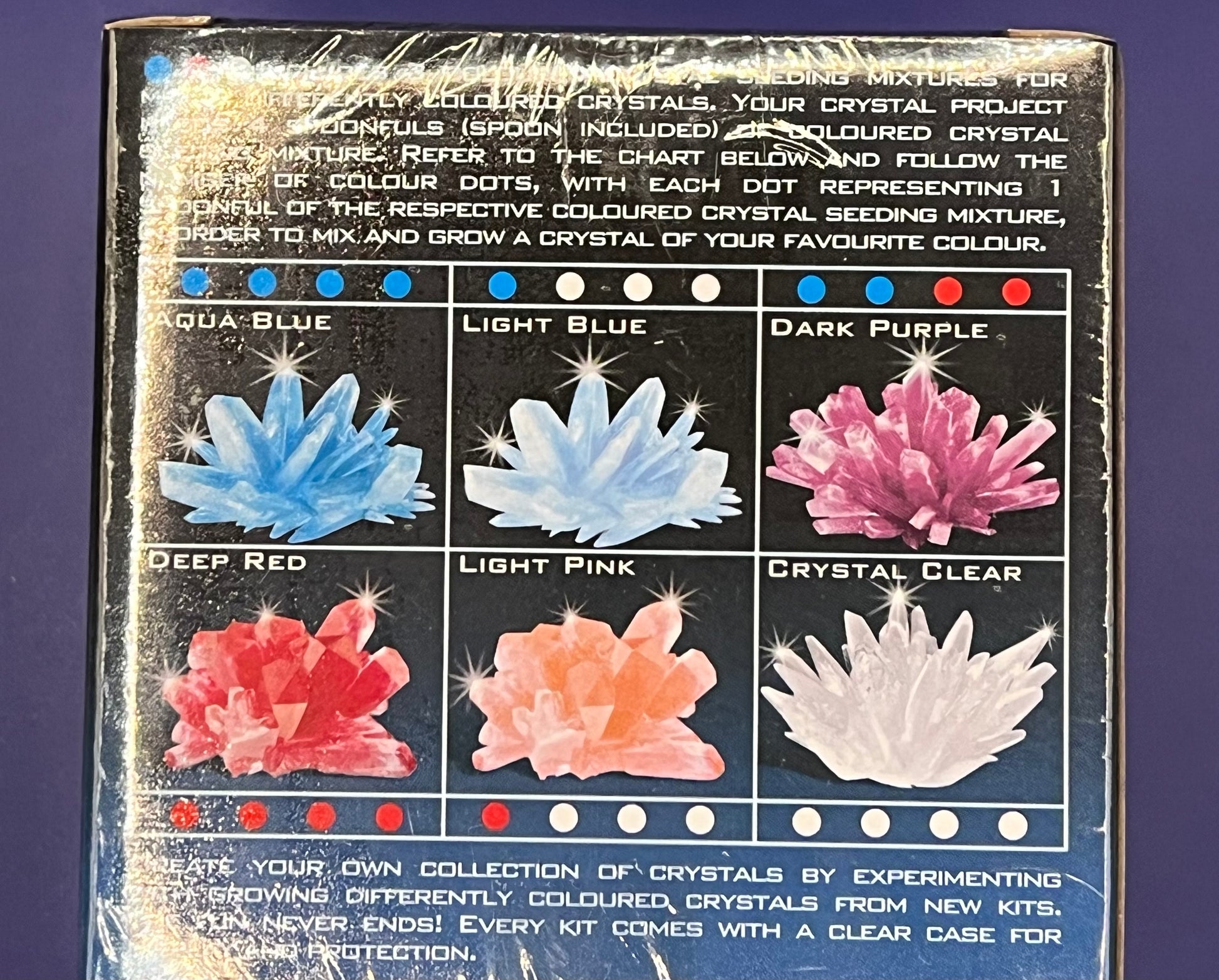 In deze stijlvolle doos vind je alles om meerdere kristallen te laten ontstaan: kristalbasis, zaadmengsels, mengkom, roerlepel en elegante presentatieschalen om jouw creaties later te tonen.