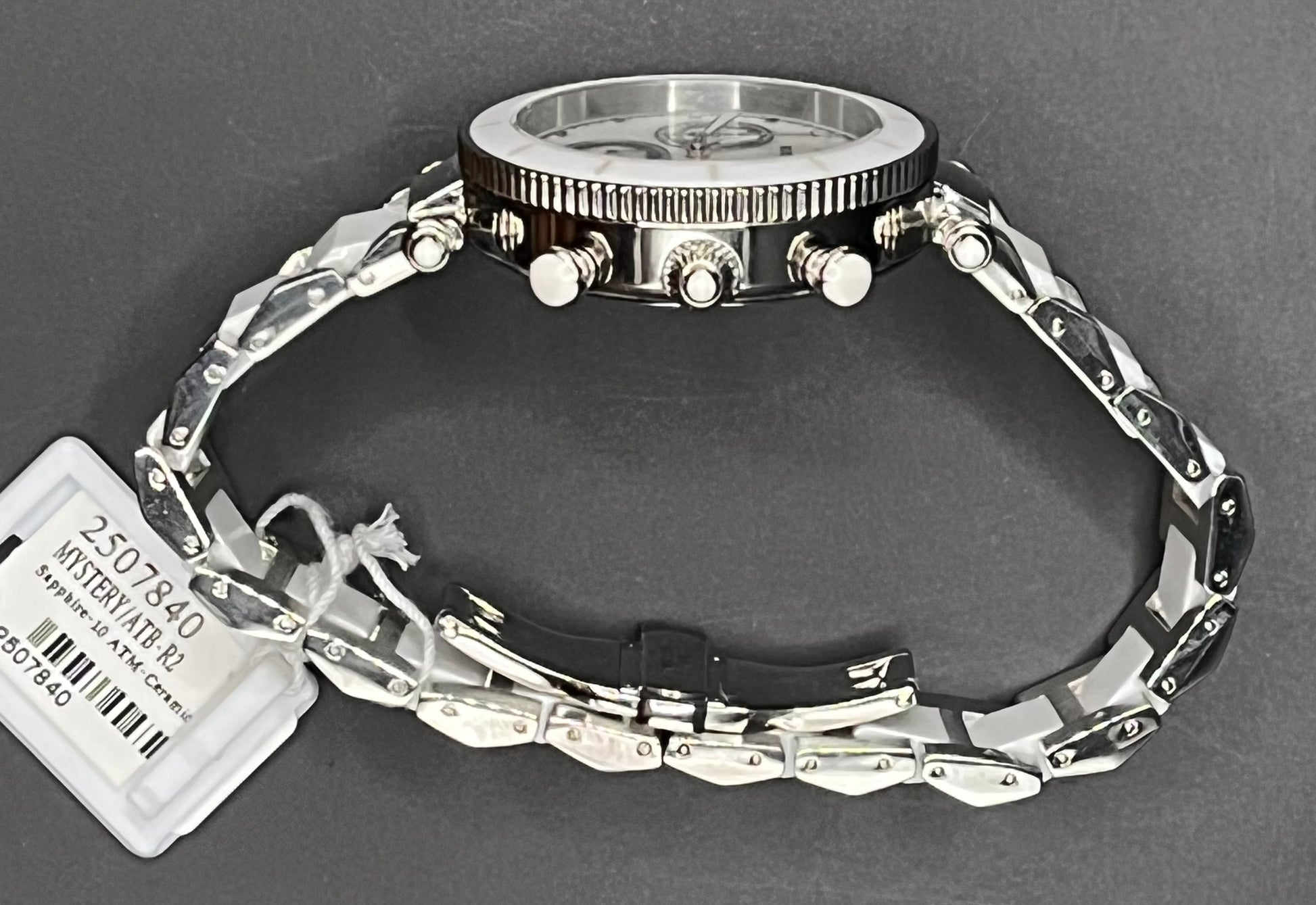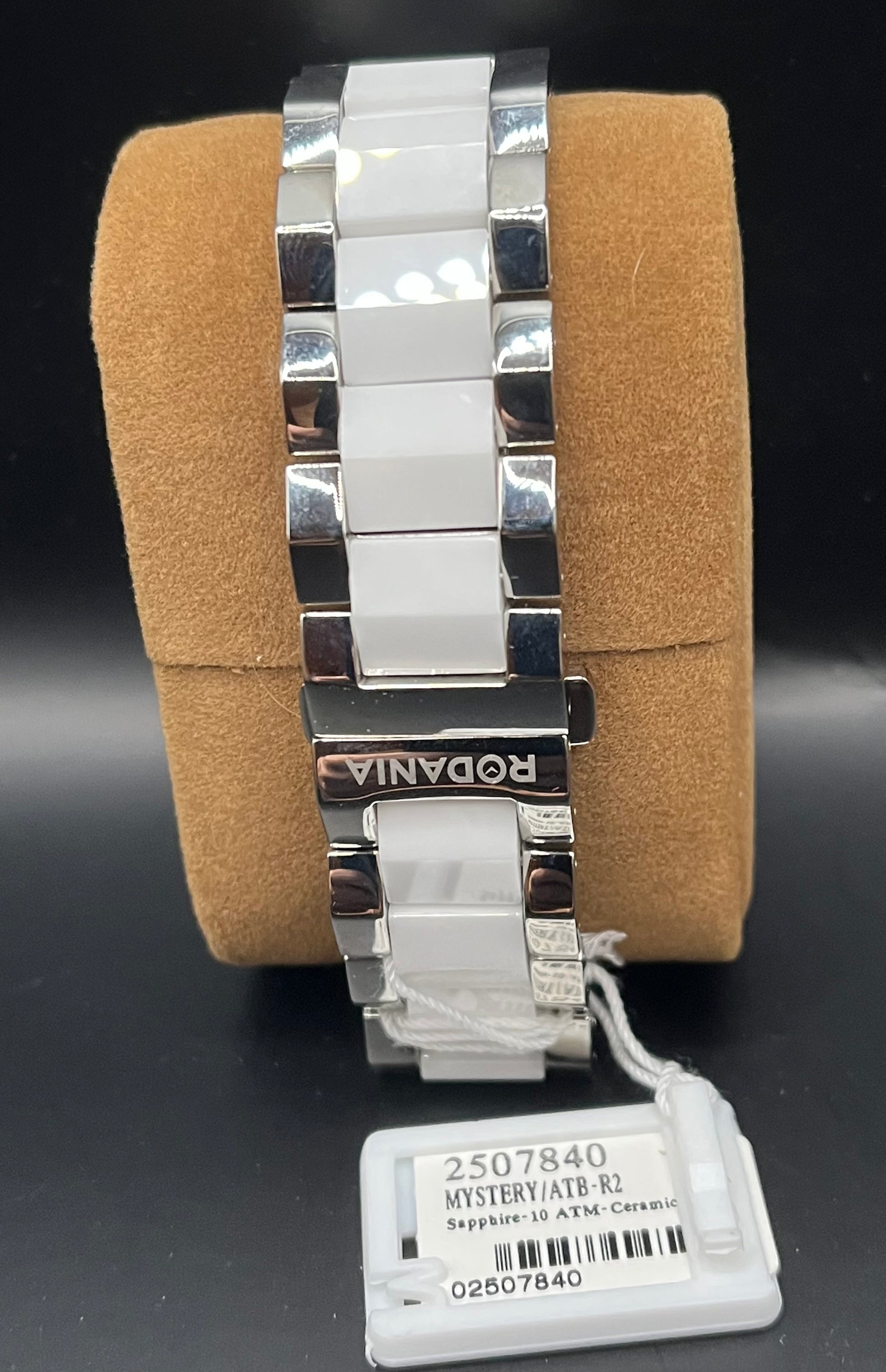 Dit verfijnde dameshorloge uit de Rodania Mystery-collectie combineert Zwitserse precisie met een tijdloos elegante uitstraling. De combinatie van glanzend roestvrij staal en wit keramiek geeft dit horloge een moderne, luxueuze look die perfect past bij elke gelegenheid.