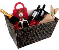 Mand, golfkarton, 43,2 × 27 × 25,8 cm, rechthoekig, zwart/goud.Met deze grote draagbare kartonnen cadeaumanden kun je in een handomdraai bijzondere themapakketten samenstellen: denk aan delicatessen, verzorgingsproducten, streekpakketten, verwenpakketten, babypakket, (houten) speelgoed … de mogelijkheden zijn eindeloos.