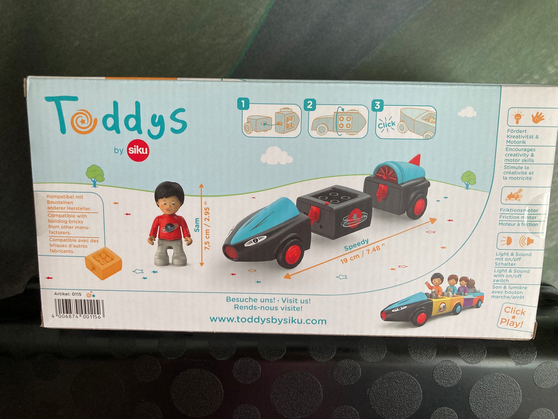 De auto Speedy kan in drie delen uit elkaar worden genomen en kan met andere Toddy's voertuigen worden gecombineerd. Licht- en geluidseffecten ondersteunen het karakter van het voertuig. Sam Speedy is compatibel met componenten van andere fabrikanten.