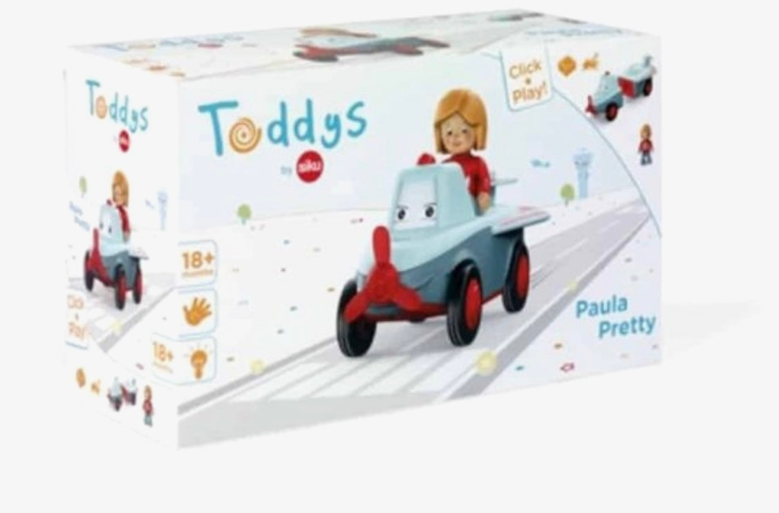 Speelfiguur Paula is zeer beweeglijk: het hoofd kan worden gedraaid, de armen kunnen omhoog en de benen kunnen worden geknikt. Het vliegtuig Pretty kan in twee delen uit elkaar worden genomen en kan met andere Toddy's voertuigen worden gecombineerd.