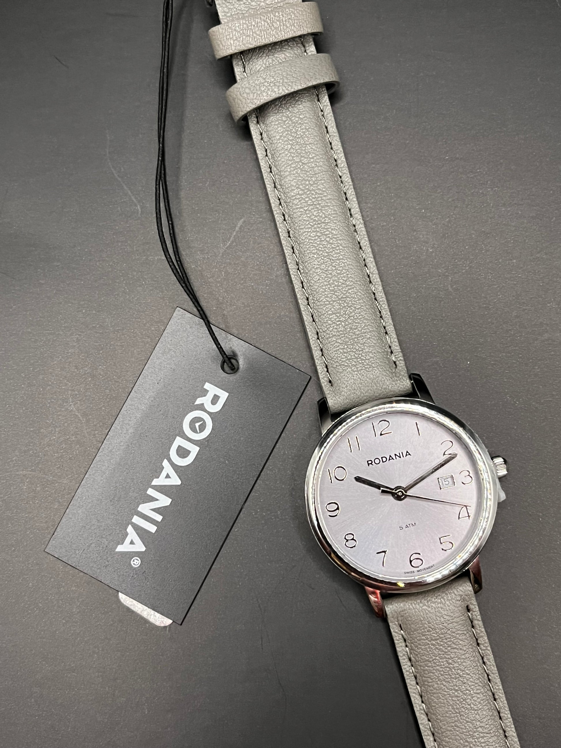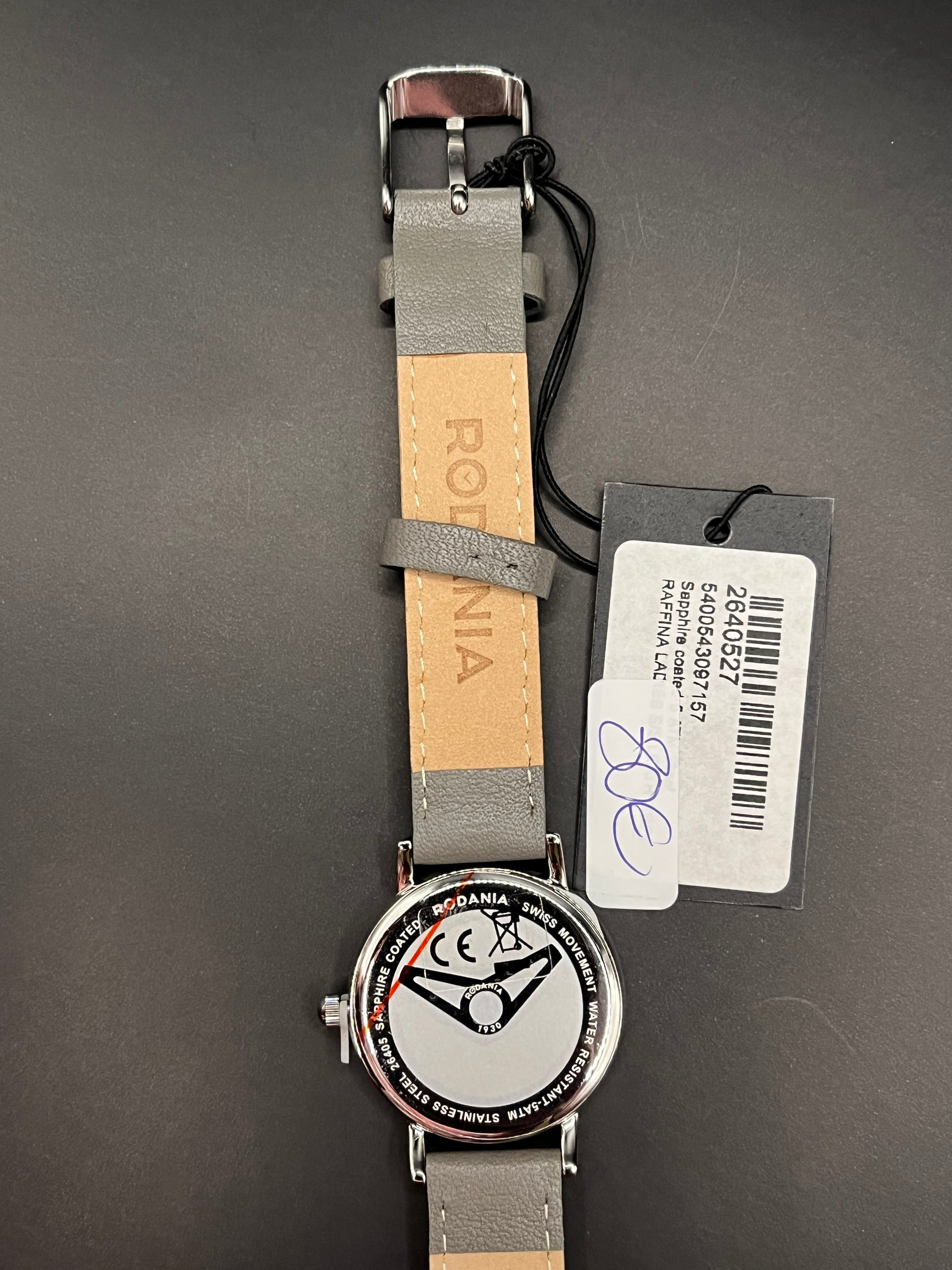 - Band: Grijze lederen band met stiksels, gesp-sluiting
