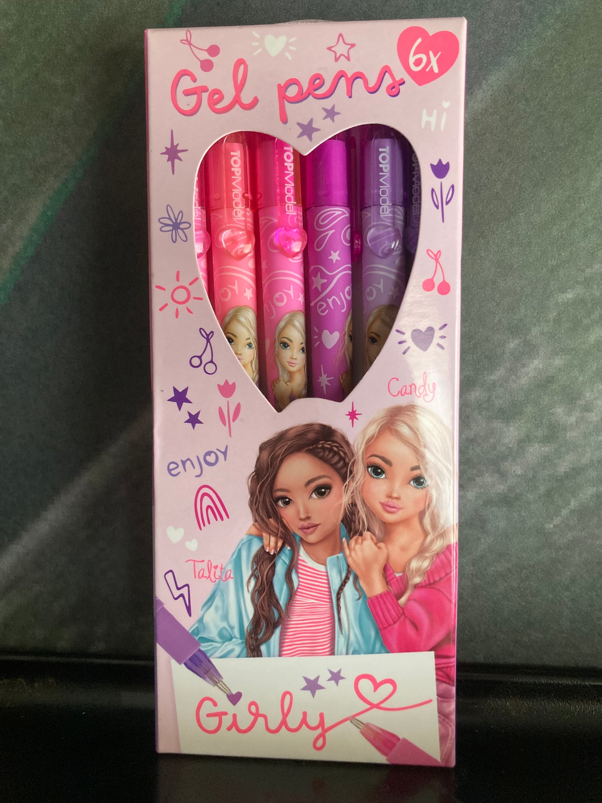Girly gelpennen! De TOPModel pennen in roze, paarse en lila tinten hebben afbeeldingen van mooie modellen en een schattig hartje op de clip van de dop.